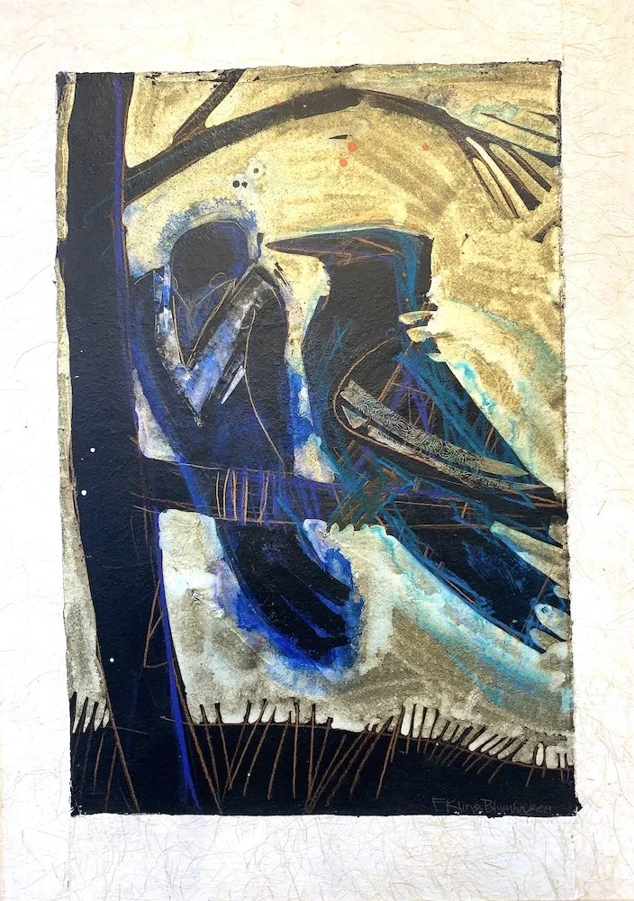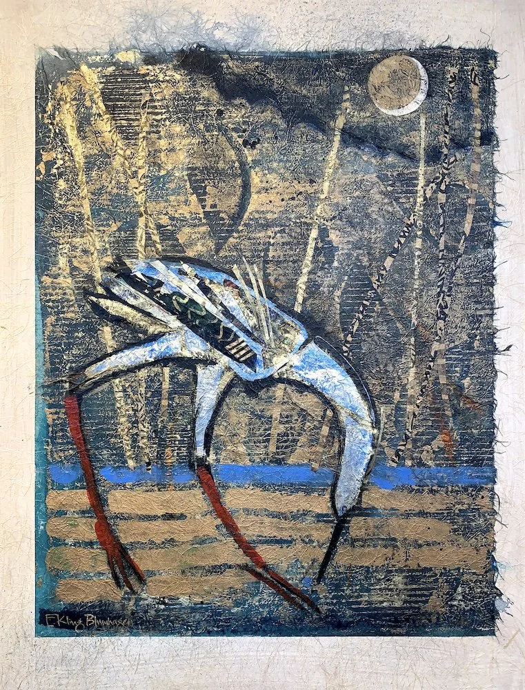 Working with handmade papers and acrylic paints, Blumhagen creates layered textured images of birds and wildlife in the Salish Sea region. Each piece is a thoughtful meditation on the animals that surround us, expressed in bold colorful imagery that give us a deeper appreciation of our environment.