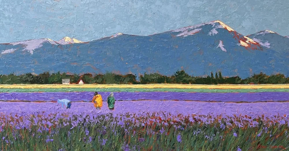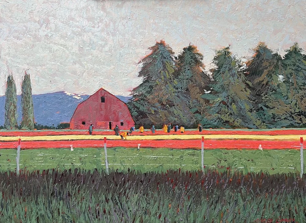 Alfred Currier paints vibrant landscapes in oil impasto from the studio he maintains in Anacortes. Plein air painting provides most of his inspiration. He often portrays the migrant workers in the tulip fields of the Skagit Valley as part of his motif. Currier has traveled widely, painting on location in Greece, France, Italy, Holland, Argentina, Mexico, Hawaii, Alaska, as well as the continental United States.