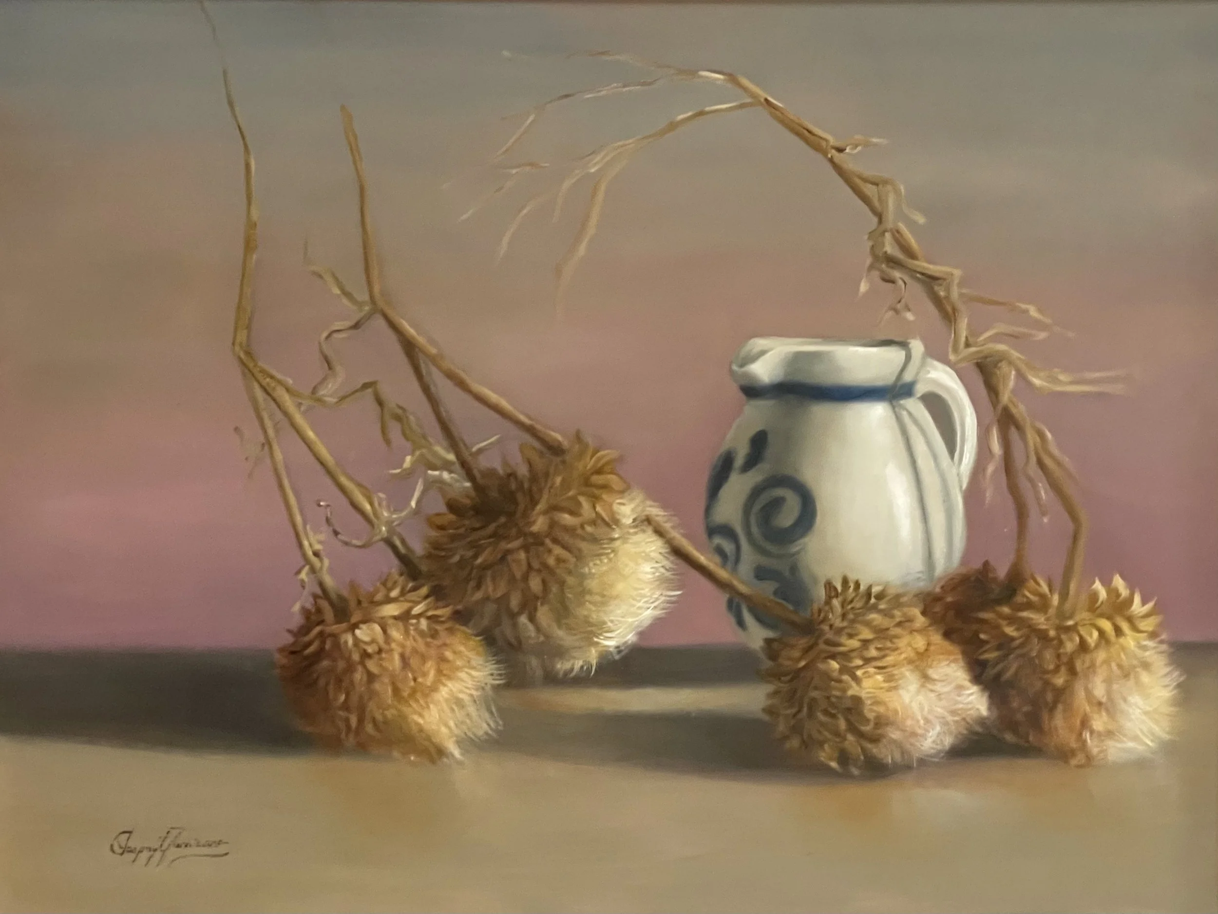 Jurriaans states: “I love working from life, especially with flowers and food, as their beauty fades quickly. (nowadays technology will help but it is not the same). I love to make decisive choices while the subject still looks fresh, enhancing my ability to respond instinctively and creatively in the moment. Painting the Still Life has helped me to refine my skills and explore new techniques and I love painting the beauty of simple things.”