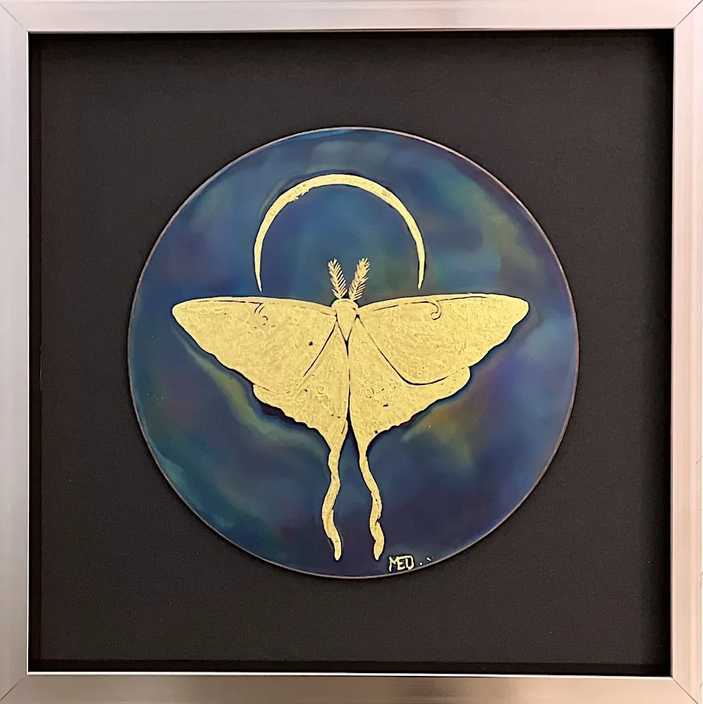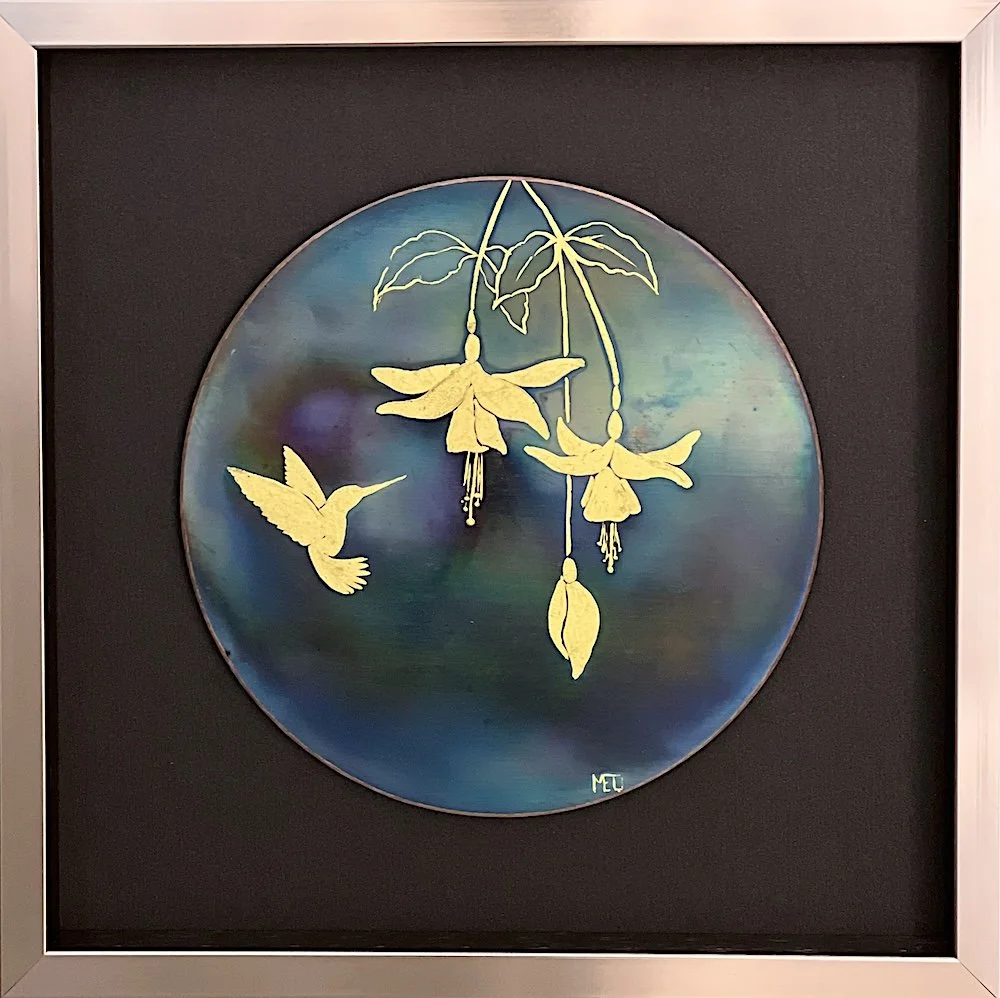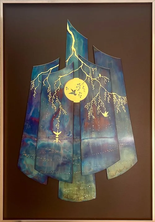 After applying the gold leaf design a process of heat treating the copper allows her to create iridescent color patterns, further enhancing the gold image.